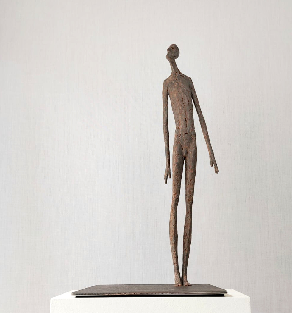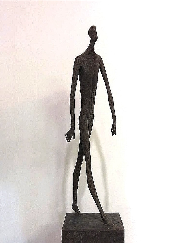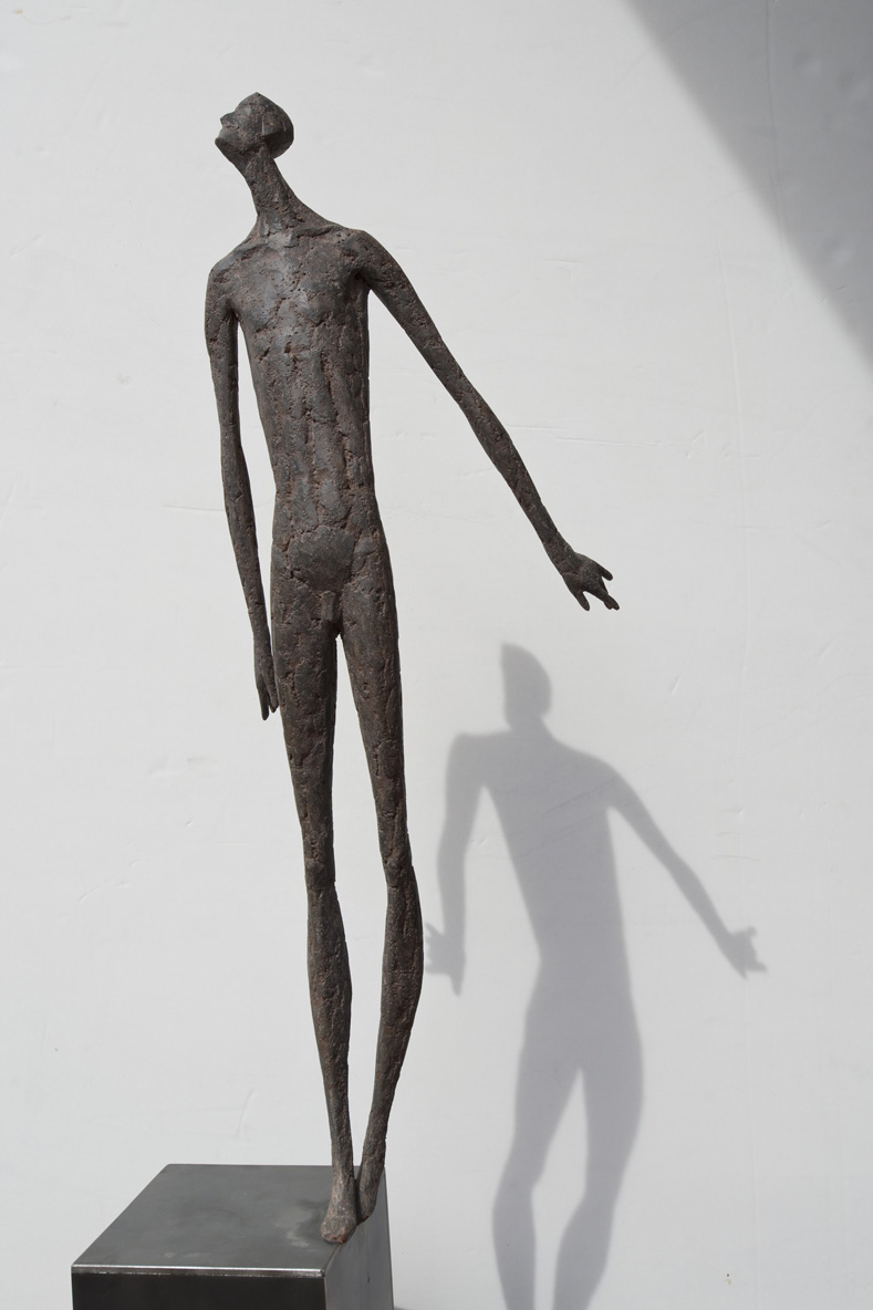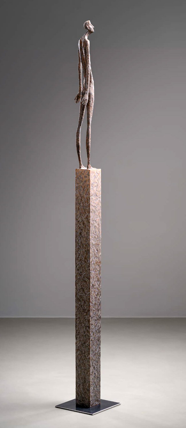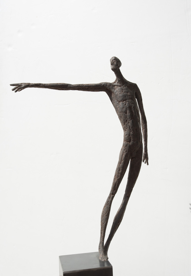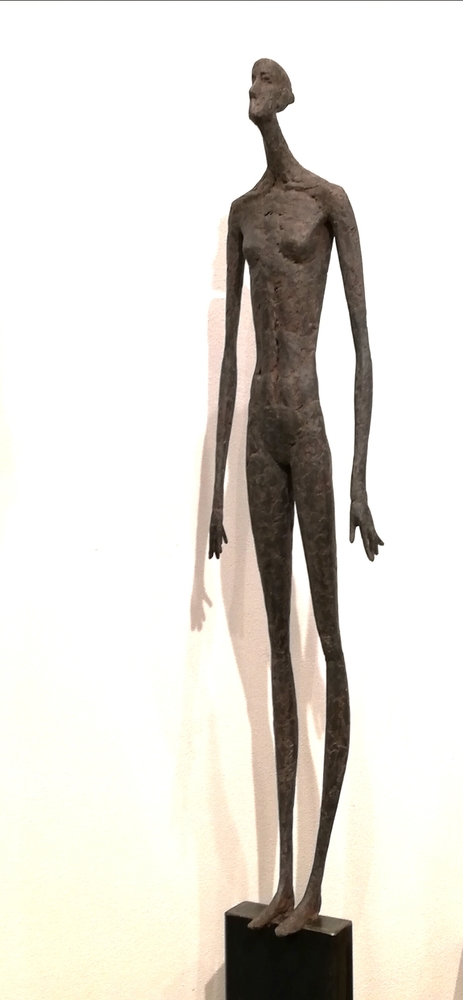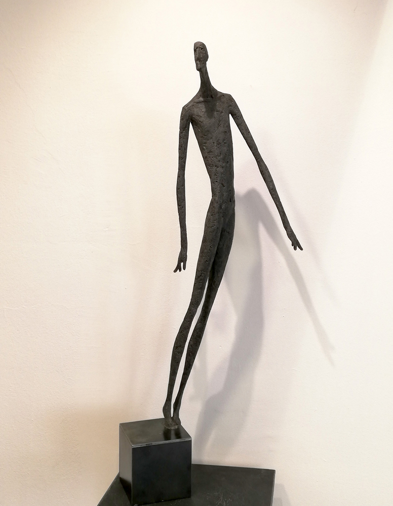 Moroder fa suo questo sentimento di purificazione e di elevazione dell’Io. L’essere umano si fa esile, sottile e perde i connotati propri dell’espressione facciale. L’identità univoca diventa secondaria, inutile. La ricerca di Moroder conduce all’universale passando per l’individuale, ottenendo da subito un dialogo diretto e una vicinanza con l’interlocutore. Nelle sculture di Moroder ci sono i primitivi, gli antichi, gli Etruschi, ci sono milioni di stratificazioni di immagini che corrono nei nostri occhi, influenzati o meno da culture differenti, ci sono i grandi contemporanei che hanno segnato lo sviluppo della storia dell’arte in maniera indelebile fissando dei punti di svolta nella figurazione. Non può un artista diventare orfano e privarsi di tutto questo trascorso. Moroder è figlio del suo tempo e nel suo tempo è in grado di produrre immagini nuove, straordinariamente distanti da un “prima” antico o da un passato prossimo. Stupendo il paragone con Giacometti, raffronto immediato di un occhio “popolare”, ma altrettanto distante il lavoro compiuto. La cifra stilistica della scultura di Moroder è graffiante, vibrante, elastica e si sviluppa in una, due, tre dimensioni. Il grande Giacometti lasciamolo dietro di noi - con tutto quello che ha saputo donare - e guardiamo oltre. Gli esseri plasmati da Moroder sono sospesi in un tempo e uno spazio indefiniti, godono di un’eternità provvisoria alla quale l’umano tende. Sono figli di una Madre Terra comune che li ha generati, fatti di Anima e Corpo. Sono esseri erranti, vagano alla ricerca di quell’Essenza delle cose tanto ambita da chi è ricco di spirito. La scelta (a mio avviso ardita) di una figurazione classica in un’epoca che ha visto sparire e riapparire più volte la figura umana - seppur mantenendo l’uomo al centro di ogni riflessione, anche trasposta in termini astratti - è coraggiosa e vincente. L’uomo e la donna di oggi si rispecchiano nelle sculture di Moroder: bellezza, bruttezza, instabilità ed equilibrio. Essere o non essere. Orgoglio e volontà. Il suo lavoro non è solo contemporaneo, non è solo esteticamente appagante, non è fine a se stesso. Moroder riesce con estrema abilità a comunicare con ognuno di noi, ad entrare in confidenza col nostro sentire e ad accompagnarci altrove, conducendoci in qualcosa di più bello di più alto. Eleva lo spirito, oltre che l’occhio.