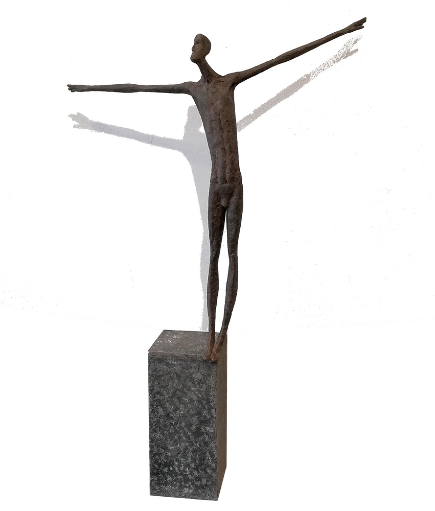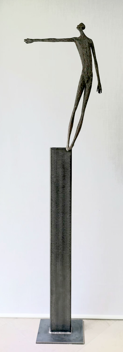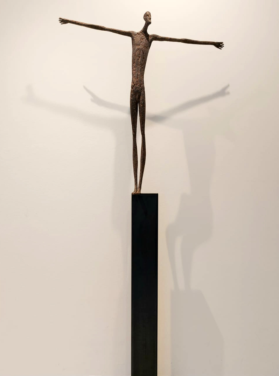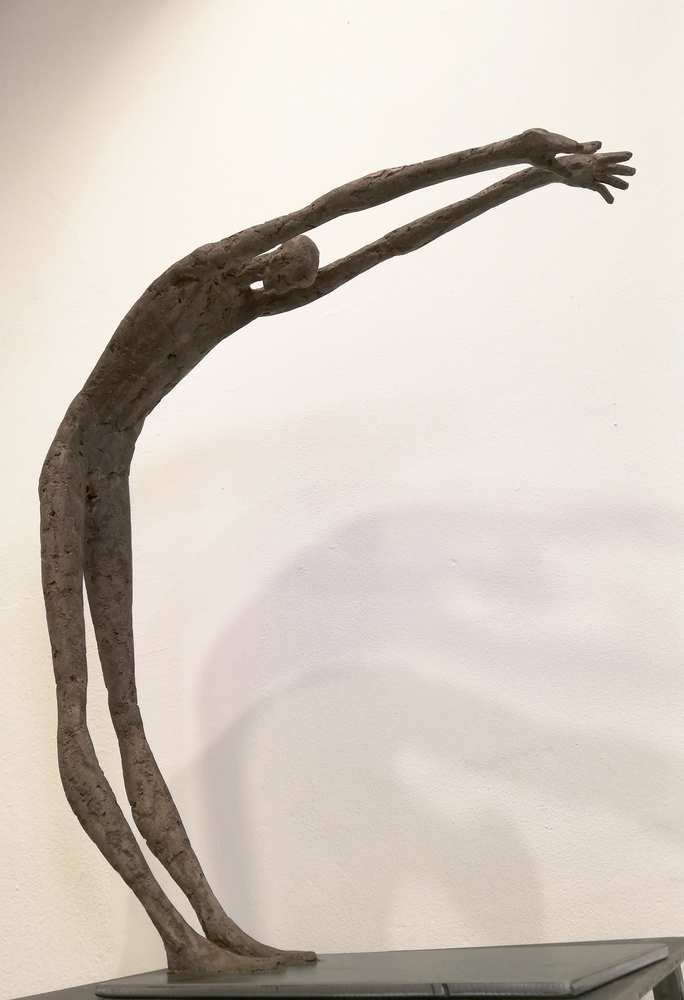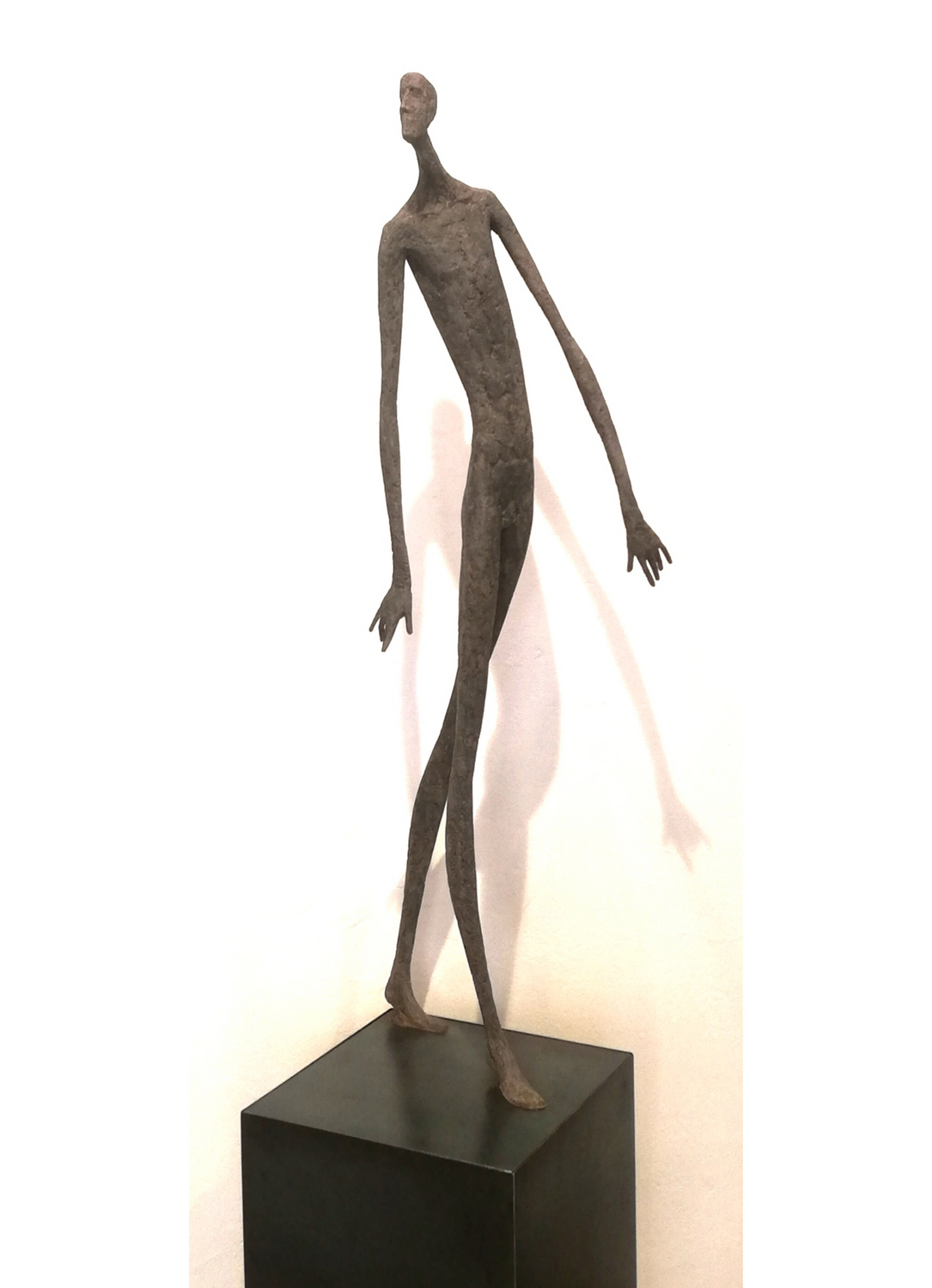 Moroder fa suo questo sentimento di purificazione e di elevazione dell’Io. L’essere umano si fa esile, sottile e perde i connotati propri dell’espressione facciale. L’identità univoca diventa secondaria, inutile. La ricerca di Moroder conduce all’universale passando per l’individuale, ottenendo da subito un dialogo diretto e una vicinanza con l’interlocutore. Nelle sculture di Moroder ci sono i primitivi, gli antichi, gli Etruschi, ci sono milioni di stratificazioni di immagini che corrono nei nostri occhi, influenzati o meno da culture differenti, ci sono i grandi contemporanei che hanno segnato lo sviluppo della storia dell’arte in maniera indelebile fissando dei punti di svolta nella figurazione. Non può un artista diventare orfano e privarsi di tutto questo trascorso. Moroder è figlio del suo tempo e nel suo tempo è in grado di produrre immagini nuove, straordinariamente distanti da un “prima” antico o da un passato prossimo. Stupendo il paragone con Giacometti, raffronto immediato di un occhio “popolare”, ma altrettanto distante il lavoro compiuto. La cifra stilistica della scultura di Moroder è graffiante, vibrante, elastica e si sviluppa in una, due, tre dimensioni. Il grande Giacometti lasciamolo dietro di noi - con tutto quello che ha saputo donare - e guardiamo oltre. Gli esseri plasmati da Moroder sono sospesi in un tempo e uno spazio indefiniti, godono di un’eternità provvisoria alla quale l’umano tende. Sono figli di una Madre Terra comune che li ha generati, fatti di Anima e Corpo. Sono esseri erranti, vagano alla ricerca di quell’Essenza delle cose tanto ambita da chi è ricco di spirito. La scelta (a mio avviso ardita) di una figurazione classica in un’epoca che ha visto sparire e riapparire più volte la figura umana - seppur mantenendo l’uomo al centro di ogni riflessione, anche trasposta in termini astratti - è coraggiosa e vincente. L’uomo e la donna di oggi si rispecchiano nelle sculture di Moroder: bellezza, bruttezza, instabilità ed equilibrio. Essere o non essere. Orgoglio e volontà. Il suo lavoro non è solo contemporaneo, non è solo esteticamente appagante, non è fine a se stesso. Moroder riesce con estrema abilità a comunicare con ognuno di noi, ad entrare in confidenza col nostro sentire e ad accompagnarci altrove, conducendoci in qualcosa di più bello di più alto. Eleva lo spirito, oltre che l’occhio.