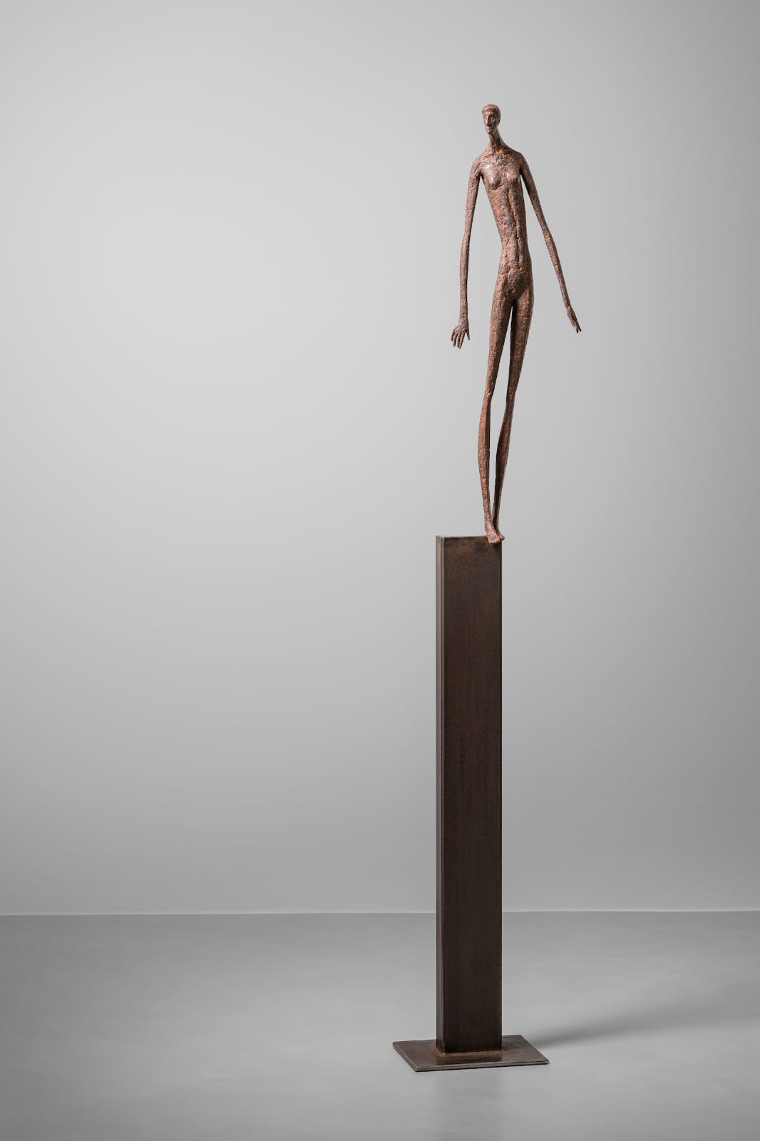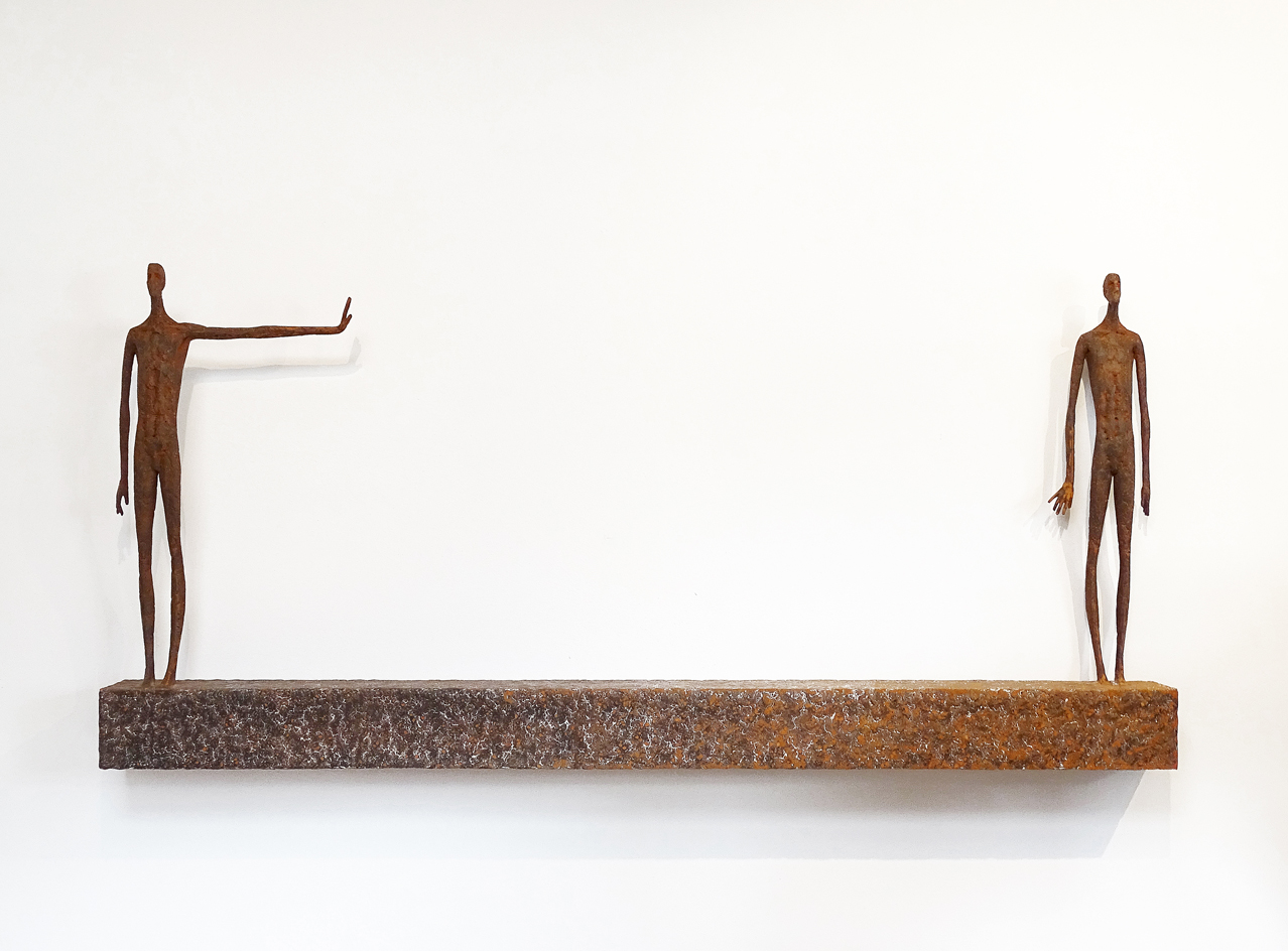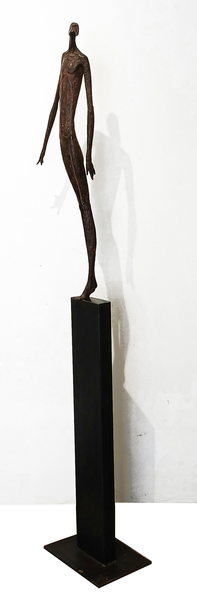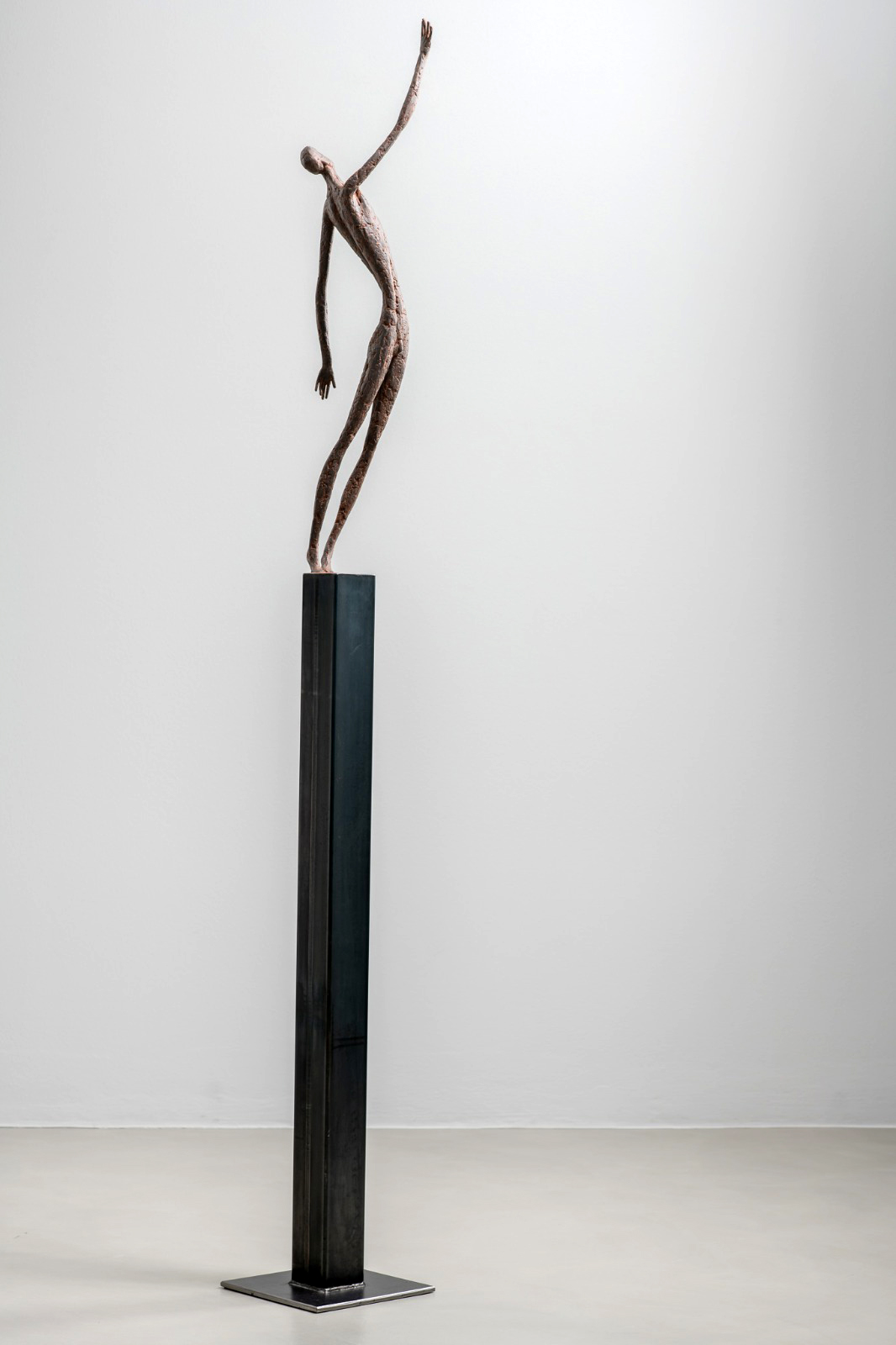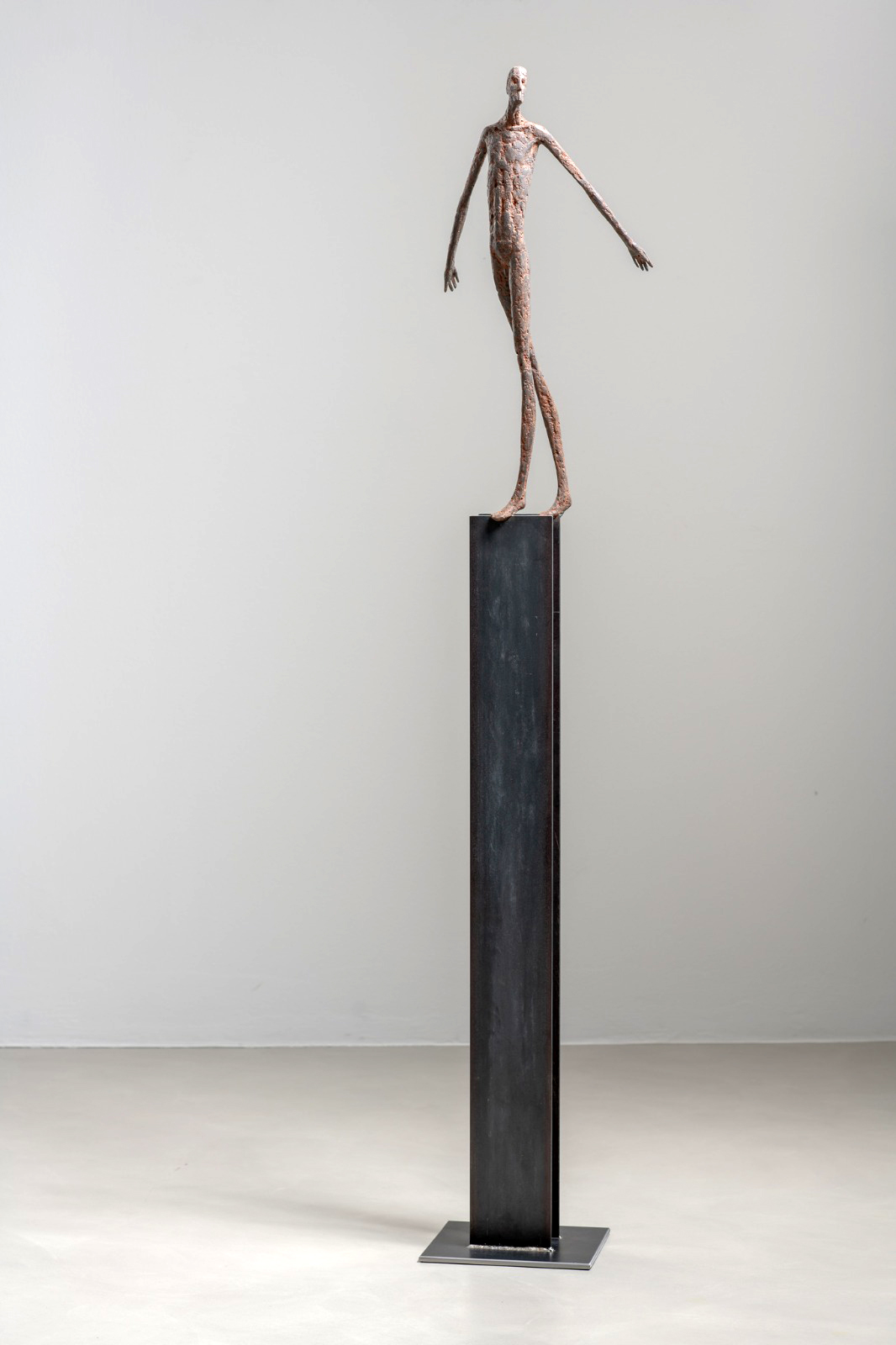 Moroder fa suo questo sentimento di purificazione e di elevazione dell’Io. L’essere umano si fa esile, sottile e perde i connotati propri dell’espressione facciale. L’identità univoca diventa secondaria, inutile. La ricerca di Moroder conduce all’universale passando per l’individuale, ottenendo da subito un dialogo diretto e una vicinanza con l’interlocutore. Nelle sculture di Moroder ci sono i primitivi, gli antichi, gli Etruschi, ci sono milioni di stratificazioni di immagini che corrono nei nostri occhi, influenzati o meno da culture differenti, ci sono i grandi contemporanei che hanno segnato lo sviluppo della storia dell’arte in maniera indelebile fissando dei punti di svolta nella figurazione. Non può un artista diventare orfano e privarsi di tutto questo trascorso. Moroder è figlio del suo tempo e nel suo tempo è in grado di produrre immagini nuove, straordinariamente distanti da un “prima” antico o da un passato prossimo. Stupendo il paragone con Giacometti, raffronto immediato di un occhio “popolare”, ma altrettanto distante il lavoro compiuto. La cifra stilistica della scultura di Moroder è graffiante, vibrante, elastica e si sviluppa in una, due, tre dimensioni. Il grande Giacometti lasciamolo dietro di noi - con tutto quello che ha saputo donare - e guardiamo oltre. Gli esseri plasmati da Moroder sono sospesi in un tempo e uno spazio indefiniti, godono di un’eternità provvisoria alla quale l’umano tende. Sono figli di una Madre Terra comune che li ha generati, fatti di Anima e Corpo. Sono esseri erranti, vagano alla ricerca di quell’Essenza delle cose tanto ambita da chi è ricco di spirito. La scelta (a mio avviso ardita) di una figurazione classica in un’epoca che ha visto sparire e riapparire più volte la figura umana - seppur mantenendo l’uomo al centro di ogni riflessione, anche trasposta in termini astratti - è coraggiosa e vincente. L’uomo e la donna di oggi si rispecchiano nelle sculture di Moroder: bellezza, bruttezza, instabilità ed equilibrio. Essere o non essere. Orgoglio e volontà. Il suo lavoro non è solo contemporaneo, non è solo esteticamente appagante, non è fine a se stesso. Moroder riesce con estrema abilità a comunicare con ognuno di noi, ad entrare in confidenza col nostro sentire e ad accompagnarci altrove, conducendoci in qualcosa di più bello di più alto. Eleva lo spirito, oltre che l’occhio.
